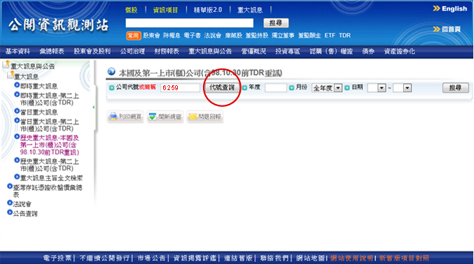 株式コード6259を入力してから、「検索」をクリックしてください。